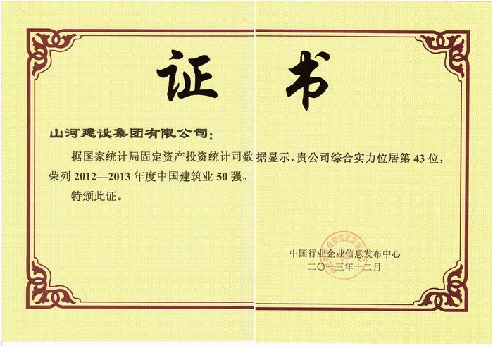 由国家统计局提供最新权威数据支持,中国行业企业信息发布中心主办的“2013第十二届中国建筑业50强测评成果发布暨颁奖典礼”于2013年12月在京举行。会上发布了中国建筑业50强名单,万搏体育集团位居第43名,提前两年实现了万搏体育集团 “二五”目标中的该项指标。