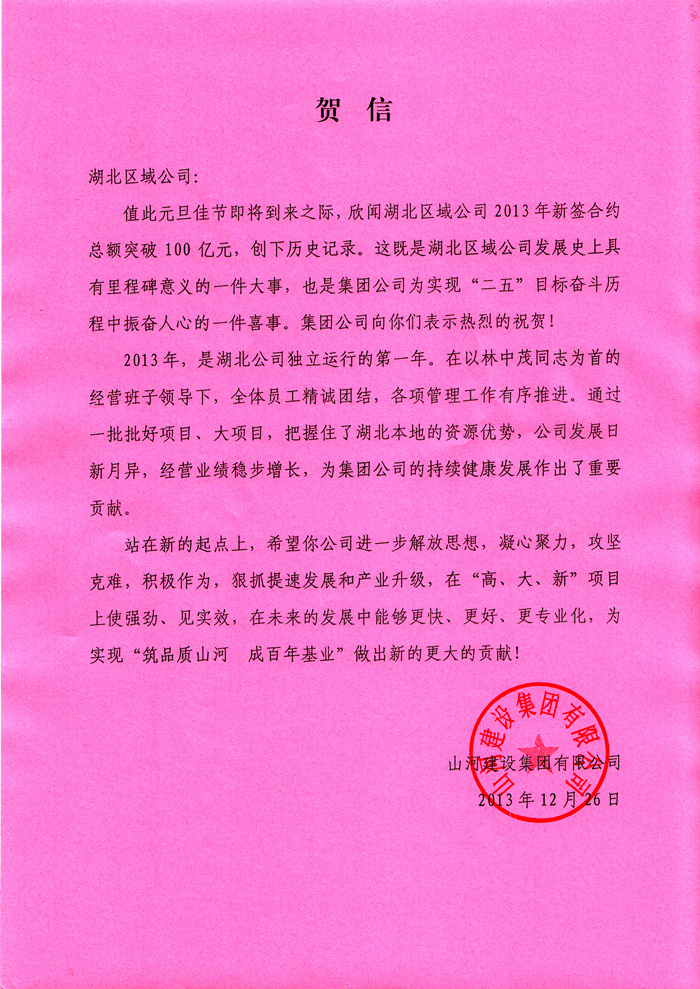 2013年,湖北区域公司新签合约总额突破100亿元,“百亿湖北”目标提前两年实现。这是湖北区域公司发展史上具有里程碑意义的一件大事,也是集团公司为实现“二五”目标奋斗历程中振奋人心的一件喜事。