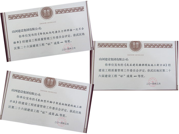 2013年,集团及区域公司技术部门和项目部的相关技术管理人员,针对施工过程中存在的质量问题,围绕健全制度、提高质量、创造效益为核心,积极开展QC活动,上述获奖的QC成果就是其中的代表。本次QC成果发布,汉阳人信汇项目的《高层建筑楼梯模板施工新方法》、招商雍华府项目的《降低纵向电渣压力焊焊接一次不合格率》获得市一等奖,奥山世纪城项目的《悬挑型外脚手架悬挑钢梁的施工新方法》获得市二等奖。取得这样的成绩,得益于集团公司及区域公司领导的支持和项目部各位同仁的共同努力。