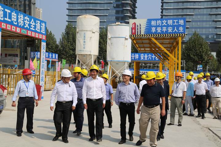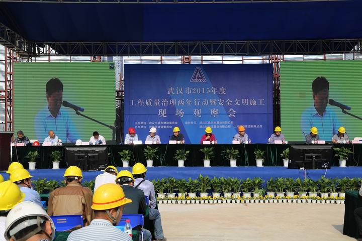 2015年10月22日上午,武汉市2015年度工程质量治理两年行动暨安全文明施工现场观摩会在万搏体育集团湖北公司汇通新长江中心项目召开。湖北省质安总站副站长周伟,武汉市稽查站总工程师曹立新、质检站处长李华、安全站副站长熊威,武昌区文明办主任肖永高、安监局局长何学军、建委书记周旗福、建委副局长王水泉、建委副主任山峰,湖北新长江置业有限公司董事长陈学明,北京纵横监理有限公司副总经理张忠,万搏体育集团董事长程理财、副总经理程秋明、湖北公司常务副总经理柯为正、副总经理罗定军等领导参加了会议。武汉市建管办杨凡主任主持会议。