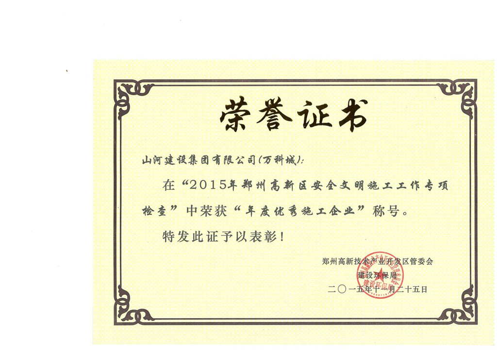 11月25日,在郑州高新区安全文明施工专项检查中,万搏体育建设集团有限公司荣获由郑州高新区管理会建设环保局授予的“年度优秀施工企业”荣誉称号。