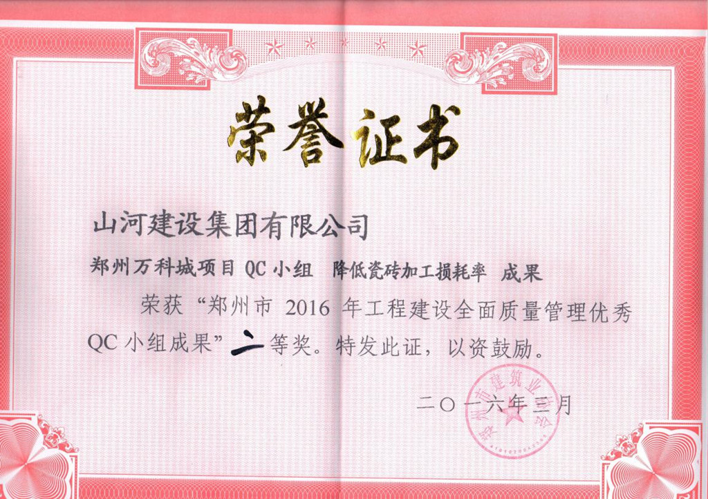 近日,2016年郑州市优秀QC小组成果评选结果揭晓。经专家评审,由万搏体育集团郑州万科城项目QC小组编写的《降低瓷砖加工损耗率》成果荣获“郑州市2016年工程建设全面质量管理优秀QC小组成果”二等奖。