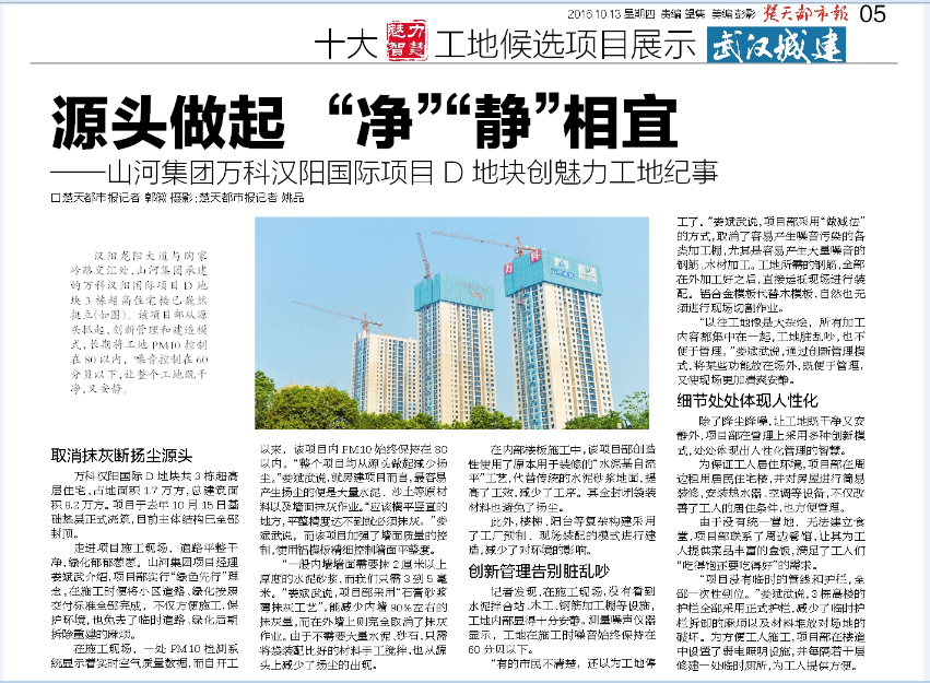 汉阳龙阳大道与陶家岭路交汇处,万搏体育集团承建的万科汉阳国际项目D地块3栋超高住宅楼已巍然挺立。该项目部从源头抓起,创新管理和建造模式,长期将工地PM10控制在80以内,噪音控制在60分贝以下,让整个工地既干净,又安静。