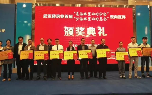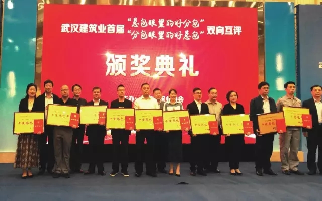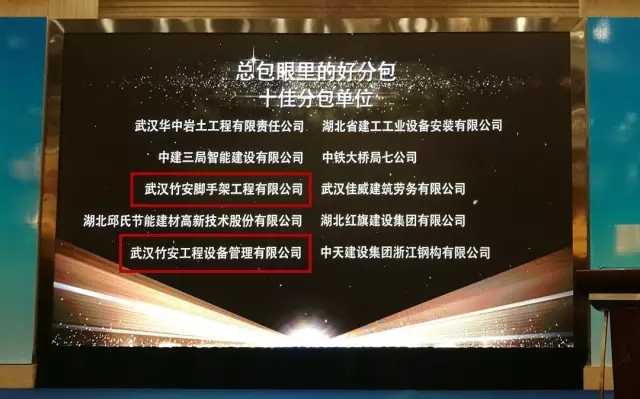 今日,武汉建筑业协会在光谷金盾大酒店三楼举行2015年总分包互评颁奖典礼活动。万搏体育集团获颁“十佳总包”,集团旗下公司竹安脚手架与竹安设备则获颁“十佳分包”,双双上榜。