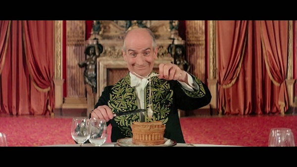 回到电影本身,每天都能到各种地方胡吃海喝的主编,被菲奈斯这个小老头演绎的生灵活现,即便对快餐嗤之以鼻,但是幽默的法国人也是以一种独有的黑色幽默方式讲述了那个年代快餐文化对传统美食文化的冲击与看法。影片最后的点睛之笔令人深思:清晨,小老头与往常一样,端坐在餐桌前,心情愉悦的切开刚刚烘焙好的新鲜糕点,里面却突然出现了一支怀表,影片至此戛然而止,或许是预示着快餐时代会随着时间的浪潮到来,无法阻挡吧。