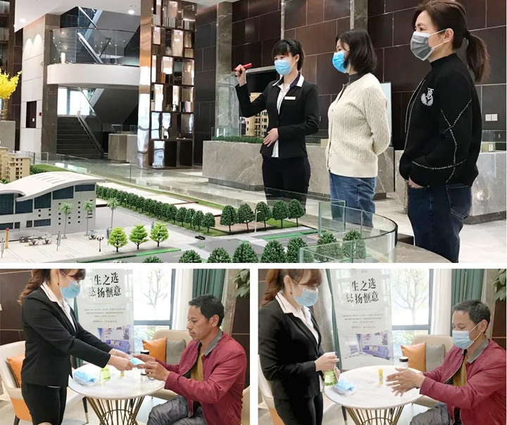 2.从停车场到前台、售楼处沙盘、接待区、办公室等公共区域每天进行两次全方位、零死角的消毒处理,小到门把手、桌椅板凳等也不放过,通过高频次的消毒,降低交叉感染风险,不留安全隐患。
