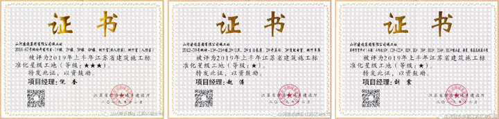 近日,万搏体育建设集团江苏公司三喜临门,公司承建的2014-67号地块(中骏柏景湾)、2012-59号地块(中骏金水湾)、亚琦万贸中心(二期)二标段三项工程荣获“2019年江苏省建筑施工标准化星级工地”称号。