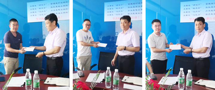 随后,总工程师苏文斌宣读了本次年中大检查的奖惩决定。总经理丁贤林为获奖项目及个人颁发了奖金。
