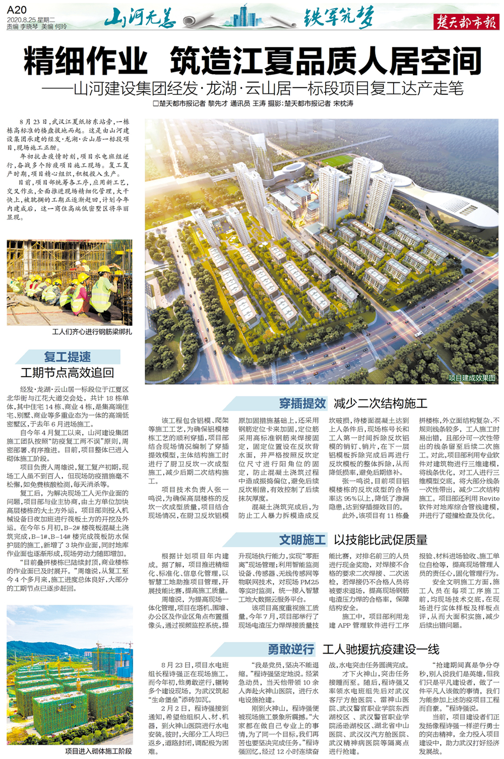 8月25日,《楚天都市报》“万搏体育无恙 铁军筑梦”特刊刊发了万搏体育建设集团项目管理公司经发·龙湖·云山居一标段项目复工达产的采访报道。这是继6月18日刊发湖北公司相关报道后,楚天都市报再次聚焦集团建设一线。在疫后重振的关键时期,集团各项目部正“火力全开”加快施工进度,全力以赴推动项目如期建成。