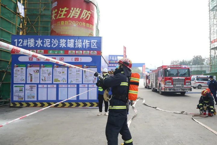 这是武汉市江夏区2020年度建筑工程消防应急救援演练活动现场的一幕,此次活动在万搏体育建设集团总承包公司经发·龙湖·云山居项目举行。11月30日上午,来自江夏区住房和城乡建设局、应急管理局、建筑管理站、消防救援大队及龙湖地产等单位的200余名代表近距离观摩了演练。