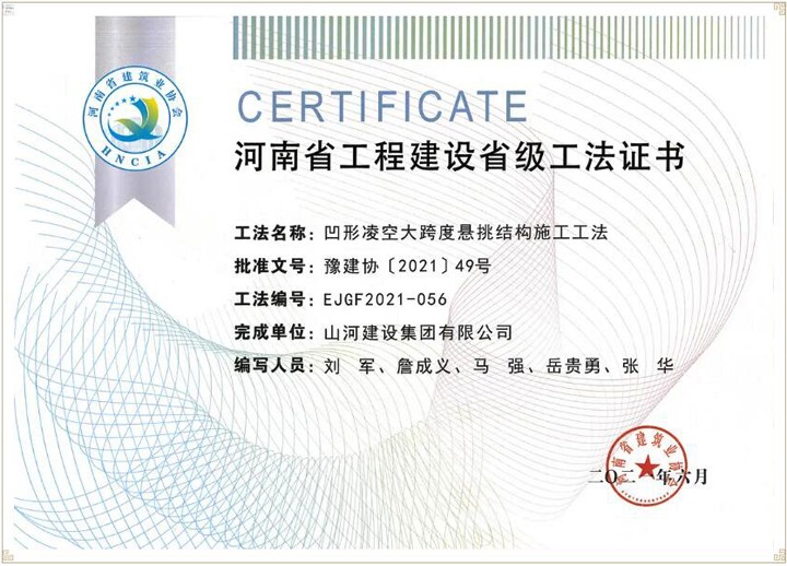近日,河南省建筑业协会公布了《2021年度第一批河南省省级工法名单》,万搏体育建设集团河南公司申报的《凹形凌空大跨度悬挑结构施工工法》成功入选,被认定为河南省工程建设省级工法。