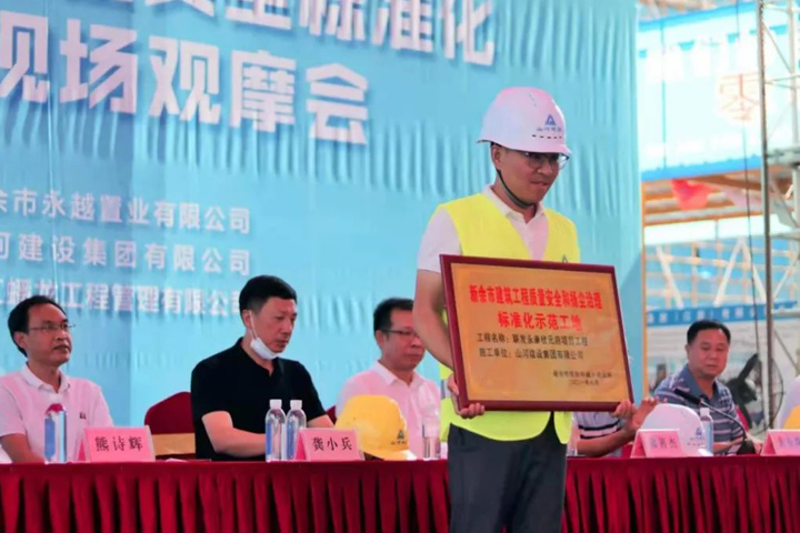 新余市质监站站长龚宇新宣读了《2021年新余市建设工程质量安全标准化暨扬尘治理示范工地表彰决定》,联发永康状元府项目成为本次全市唯一一个示范工地,项目经理袁传根作为代表上台领奖。