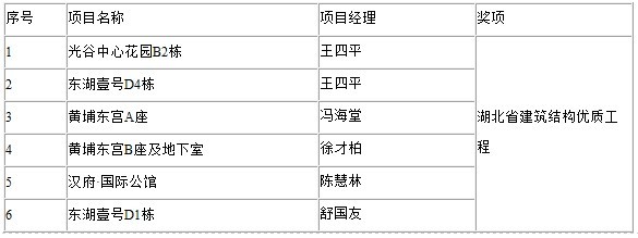 2008年4月9日,《湖北日报》第六版专版刊登《湖北省建设工程质量安全协会公告》。根据《湖北省建筑结构优质工程评审办法》,湖北省建设工程质量安全协会组织开展了2007年度省建筑结构优质工程评选活动,经对申报工程初审、核查和省建筑优质工程评审,全省有323项工程荣获2007年度湖北省建筑结构优质工程奖,其中,万搏体育集团有光谷中心花园、东湖壹号、黄埔东宫、汉府・国际公馆等6项工程获此奖项。具体如下表: